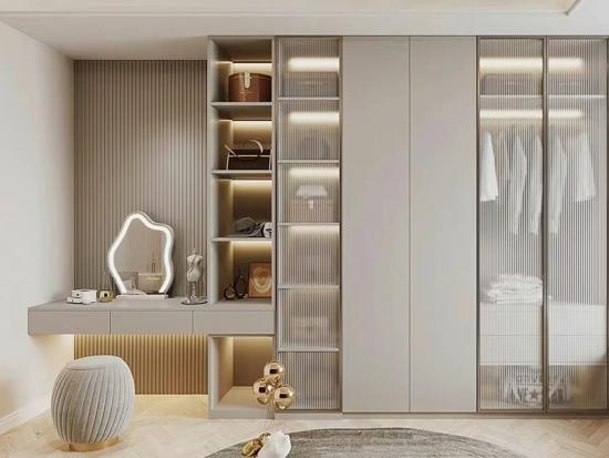 Ito modernong kahoy na aparador nagtatampok ng parehong mga vertical glass na pinto at particleboard na pinto, pati na rin ang mga bukas na compartment. Nilagyan din ito ng dressing table. Ito multi-functional na aparador ay angkop para sa maraming babaeng kaibigan.