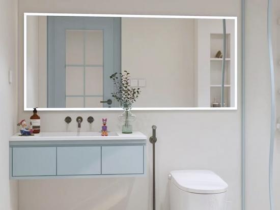Ito mapusyaw na asul na kabinet ng banyo , na ipinares sa isang malaking matalinong salamin, ay angkop para sa mga apartment ng mga batang babae. Nagbibigay ito sa mga tao ng pakiramdam ng pagiging bago at kagandahan