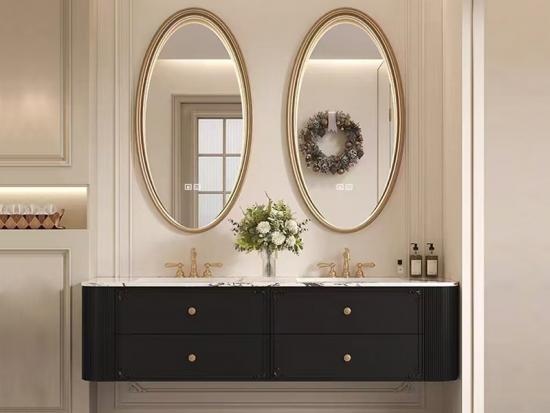 Ito double-sink French bathroom vanity , na may mga itim na pinto ng cabinet at ginintuang hardware, ay parehong elegante at sunod sa moda. Dalawang hugis-itlog na smart bathroom na salamin, na may mga gintong frame na umaayon sa kulay ng hardware. Ang mga ukit sa pinto ng cabinet ay kaayon ng mga nasa dingding.