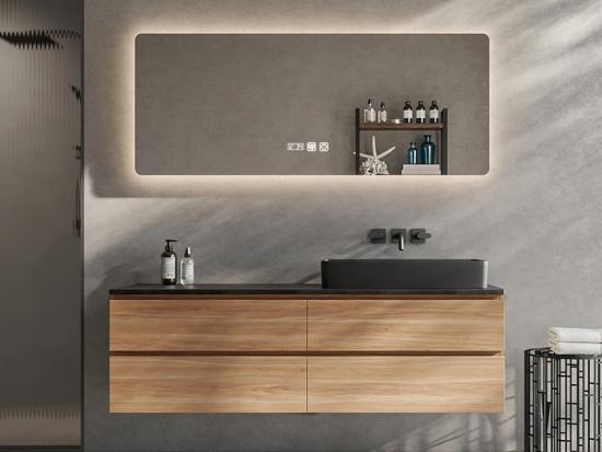 Ito kahoy na banyo vanity mahusay na pinaghalo ang mainit, natural na alindog sa modernong pagiging sopistikado. Nagtatampok ito ng apat na maluluwag na drawer para sa sapat na imbakan, magandang wood grain finish, at bold black countertop na may katugmang palanggana. Ang pinagsama-samang smart mirror ay nagdaragdag ng panghuling ugnayan ng premium na teknolohiya, na lumilikha ng espasyo sa banyo na parehong lubos na gumagana at aesthetically elevated.